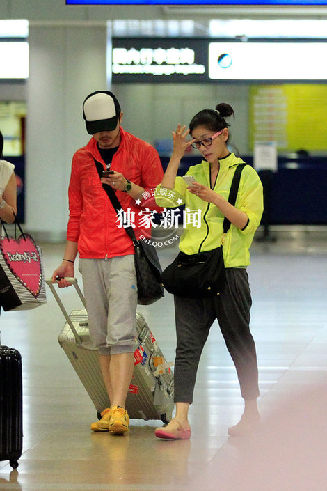 胡可沙溢撞色情侣装返京 各自玩手机少交流