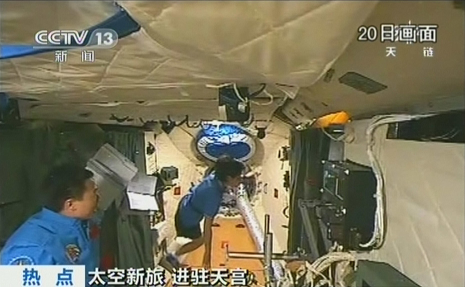 天宫一号与神舟九号组合体20日晨6时许“转正飞行”,从交会对接的倒飞状态进入正常的飞行,形成天宫在后正飞,飞船在前倒飞的飞行模式,这也是组合体的标准飞行姿态,为第二次交会对接做好准备。图为女航天员刘洋在天宫内“游泳”。(电视截图)