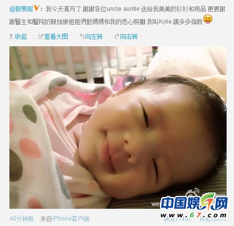 6月22日是郭羡妮女儿Kylie的满月日,郭羡妮一早发布微博,以女儿Kylie的口气谢谢大家对女儿的喜爱和关照。微博原文“我今天满月了谢谢各位uncle auntie 送给我美美的衫衫和用品 更要谢谢医生和医院的靚姑娘姐姐们对妈妈和我的悉心照顾 我叫Kylie 请多多指教”。
