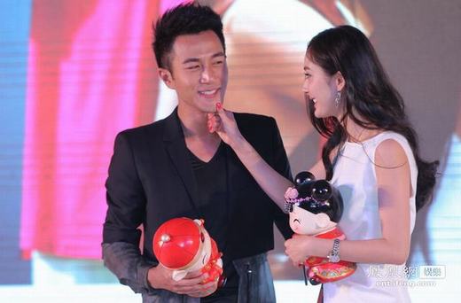 现场,杨幂和刘恺威大秀恩爱,杨幂摸刘恺威下巴假装“调戏”,刘恺威频频轻抚杨幂秀发。在媒体大声起哄“亲一个,亲一个”之后,杨幂则用手上的娃娃挡住脸,倚靠在刘恺威肩上,娇羞装嗲,尽显小女人味道。