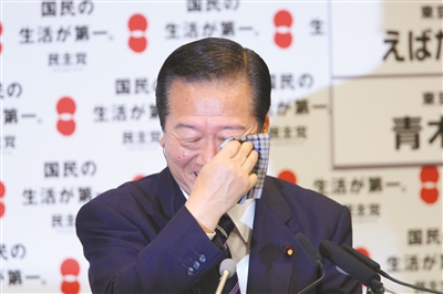 民主党前党首小泽一郎在民主党当选时落泪。