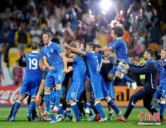 当地时间24日晚,2012年欧洲杯进行了最后一场四分之一决赛。最终,意大利队(蓝衣)在点球大战中4比2战胜英格兰队,锁定最后一个四强席位。图为意大利队庆祝晋级。