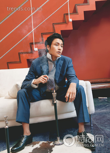 藏青色西服外套、藏青色西裤:Corneliani白色条纹衬衫:Dunhill