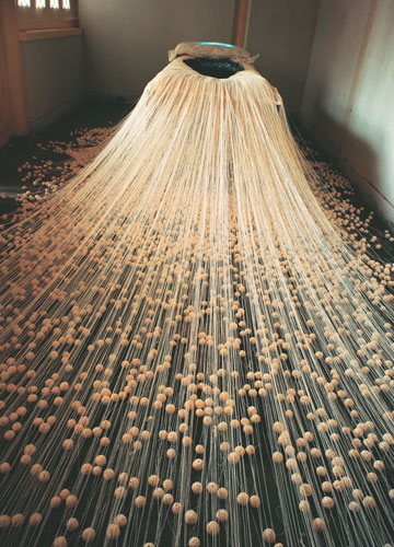 与运用绘画雕塑等传统艺术手法表现自我的艺术家有所不同的是,林天苗的作品借助材料与媒介的精致细腻、物质本身的自然属性,敏锐地表达出冷感、尖锐与直指人心的艺术气质。她对于女性生活与情感的思考像作品中常出现的细线一样,轻柔又韧性,看似凌乱却有规律地细腻缠绕着,这种纠缠也反映出艺术家对于个人情感、社会、自然的思考取向。林天苗的作品也有着某种矛盾和思考,生命的开始与消亡、呼吁与反思,停滞与希望……而新作品中,似乎更突出了某些大的命题,比如有关生命、自然、事物的本质,这些大方向的思考是艺术家对于生活带给她的直接感悟。