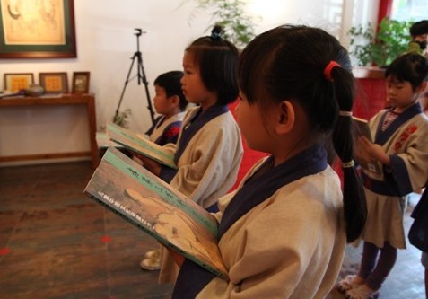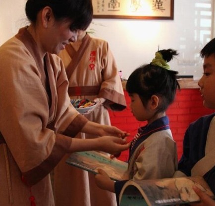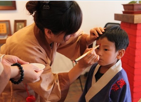 活动当日,在汉学堂老师的带领下,身着汉服的小学员们穿汉服、点朱砂、向孔子拜师、诵读国学经典……仿古人意,传承古礼,还原了一场隆重的传