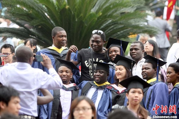 6月28日,重庆大学举行2012届学生毕业典礼暨学位授予仪式。国际学院的外国毕业生们在现场心情激动,举字牌“感谢中国,感谢重大”,呐喊声震动全场。