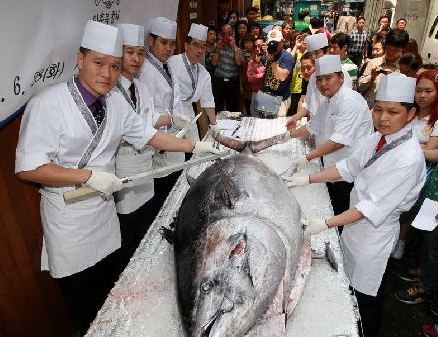 2011年6月,韩国首尔一家饭店的厨师们在展示巨型金枪鱼。当日,一条打捞自济州附近海域的巨型金枪鱼被运送到首尔,成为饭店一景。这条金枪鱼重达350公斤,长达2.7米。