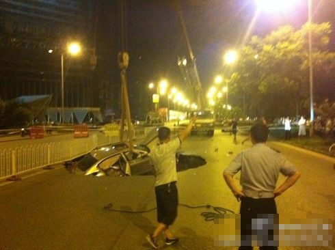 吊车将坠入塌陷坑的汽车吊出。图/末代小王爷