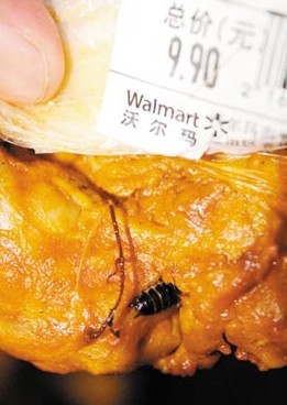 ![]() 让林先生恶心不已的半只鸡。 “当时还吃得津津有味,现在想起来就恶心。”林先生是惠州一名高中老师,趁着暑假来深圳工作。昨日中午11点多,没吃午饭的他在香蜜湖沃尔玛买了一份快餐,看到熟食柜里面有自己爱吃的“调味鸡”,花9.9元买了一整只。在沃尔玛门前的桌椅上吃完饭后林先生开始认真啃鸡,当林先生津津有味吃完鸡的一边,撕开另一半包装袋准备吃另一边时,突然发现鸡的屁股里面有黑色的物体,再仔细一看,黑色的物体是一只死蟑螂,蟑螂的前半身已经钻进鸡屁股里面,仅露出后半身和伸出的腿。