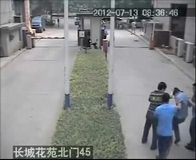 网络新闻联播记者在视频中看到,2012年7月13日上午8点19分,四名男子进入电梯,其中一人中途下电梯,受害者称剩余三人正是打人者,其中一戴眼镜者手中拿着酒瓶状物品。8点21分,一身着条纹衫男子手抓一男子头发拖入电梯,随后两人拧着被打者的胳膊。在电梯中,由条纹男子开始,三人对被打者拳打脚踢,最后将其摁倒在地板上。8点36分