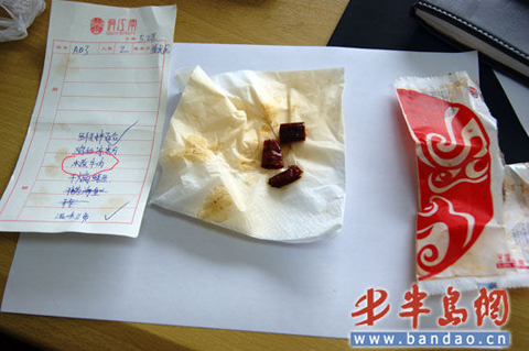 市民刘女士28号中午她和朋友一起去心海广场内的俏江南饭店聚餐。饭吃到一半时,刘女士的朋友在水煮牛肉的菜品内发现一个圆柱状的东西,上面还写着字。刘女士用筷子夹起来仔细一看,发现是“一个烟头,由于沾满油,看不清是不是吸过的。““你想想,菜里有个烟头,多让人恶心啊。而且还是在这样的大酒店,卫生条件太不让人放心了。”刘女士称,她随即用手机拍下来烟头的照片。