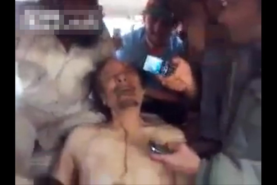 在这段长约1分钟的视频中,一个酷似卡扎菲的人的尸体被狂欢的士兵们当做了摆弄的道具。报道称,尸体赤裸上身,浑身是血,显然已经毫无生气。一名士兵抓住尸体的头并让它来回摇动,做出似乎卡扎菲还活着、并在用阿拉伯语与士兵们交谈的样子,明显是在对尸体进行嘲弄。尸体后来被反对派士兵从车里抬出,放在担架上。