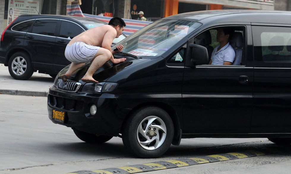记者赶到事发现场时,男子正拦在一辆面包车前方。他光着上身,下身穿着一条短裤,赤着脚。身上腿上沾满了污泥,两只手还流着鲜血。面包车见男子站在前方,立刻停下了车。男子起初不断做各种鬼脸,然后爬到面包车的引擎盖上,用拳头拍打着车前挡风玻璃。