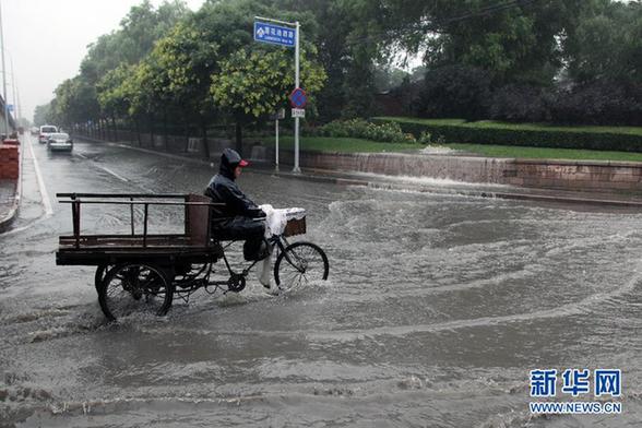 7月21日14时30分左右,北京海淀区莲花桥附近积水,给人们出行带来不便。