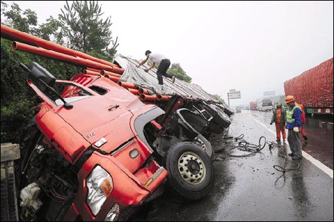 7月17日上午,杭宁高速公路德清出口附近,一辆江苏牌照的大货车侧翻在路边,车内40名乘客被紧急送往医院检查,目前4名乘客被确诊为骨折。据高速交警介绍,近期浙江雨天事故多发,事故量比平日增加三成左右。