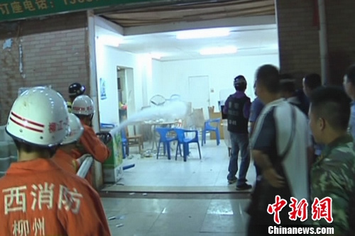 柳江县消防大队介绍,7月23日20时30分,柳江县商贸街一处居民房内,柳江县公安局民警在对一名在家中贩毒的男子实施抓捕时,男子突然持菜刀拒捕,并逃跑至楼下的宵夜店中与