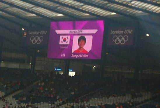 来自法新社的消息则更为详细,报道说事件的起因缘于朝鲜国旗和韩国国旗被弄混。比赛本应于当地时间晚上7点45举行,但是官方电视直播一直显示比赛延迟。通过网上发布的一张图片可以看到,在介绍球员时大屏幕上显示朝鲜球员旁边的国旗竟然是韩国国旗。