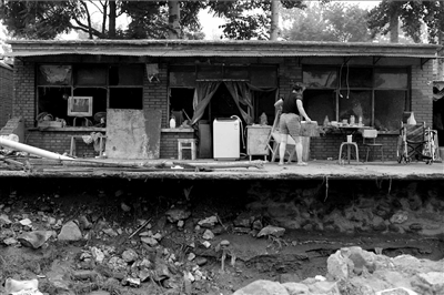暴雨当晚,32岁的卢勇正和妻子、两岁的女儿在家。当晚7点左右,他走出屋发现,一股水流从东面涌来,他赶紧把围墙上的铁门关上。但不到一分钟,围墙就被冲塌了,洪水铺天盖地袭来。卢勇吓了一跳,赶紧把两岁的女儿放在塑料大盆里,让大盆浮在水面上,他和妻子找到一架梯子后,一起抬着大盆爬上了屋顶。但是房子太矮,水很快就没过了房顶。卢勇吓得浑身发抖,惊慌失措。