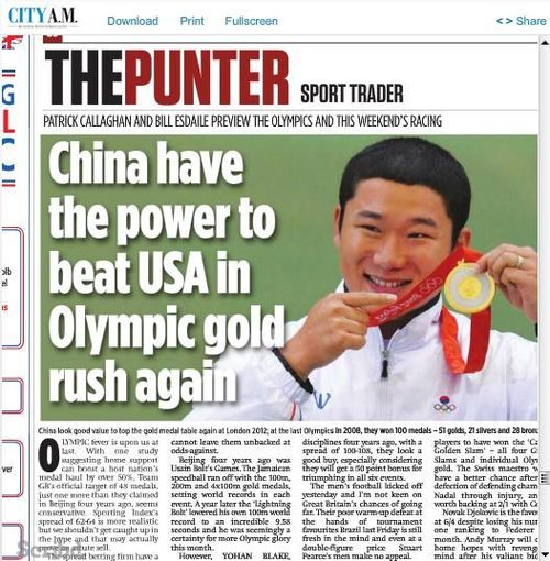 联系起两天前朝鲜女足“被韩国”,今日英国报纸又摆乌龙,实在让人唏嘘。但无论如何,这份《城市早报》还是对中国奥运金牌榜继续保持第一的8赔11赔率给出了推荐,和巴西国奥获得奥运足球冠军的赔率一样。不过下一次,他们也许应该先研究一下自己的推荐对象,即便有让他们骄傲的来自《独立报》《星期日泰晤士报》的记者们,但编辑的水平,实在应该提高。