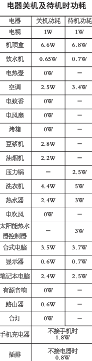 记者进行实验的这户居民家,基本从不拔下电源线的电器有电视、洗衣机、热水器、饮水机、机顶盒、油烟机、台式电脑、有源音箱、路由器、显示器、笔记本电脑、4个插排、2个手机充电器,经过测算,这些电器的总功率约为0.034KW ,一个月下来电器待机产生的电费约为14元。在未更换新电表前,每两个月的电费基本在80元至100元之间,在今年年初更换新式电表后,电费增多至120元到140元之间,在电器并没有增多的情况下,增多的电费基本上是新式电表测量到的电器待机耗电。由于实验测试中读取的是短时功率,无法与真实生活中的实际情况完全相符,因此除去这部分误差,待机耗电的电费基本上是电费总额的三分之一。