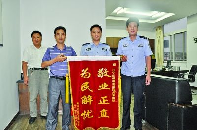 群众向余大海(右一)所在派出所送来感谢锦旗。图片由警方提供