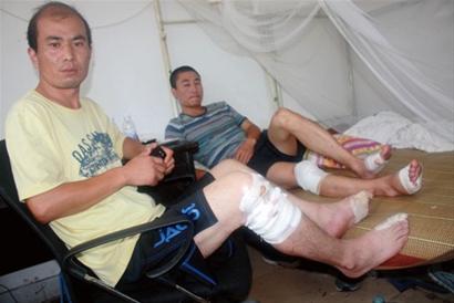 在厨师长牛明军的带领下,记者来到了于佳的休息室,记者看到他的右脚拇指根部被磨得不轻,右小腿肚上有大片血红伤口,于佳的胳膊上、腿上和后背上,总共有7处外伤,缠满大片纱布。