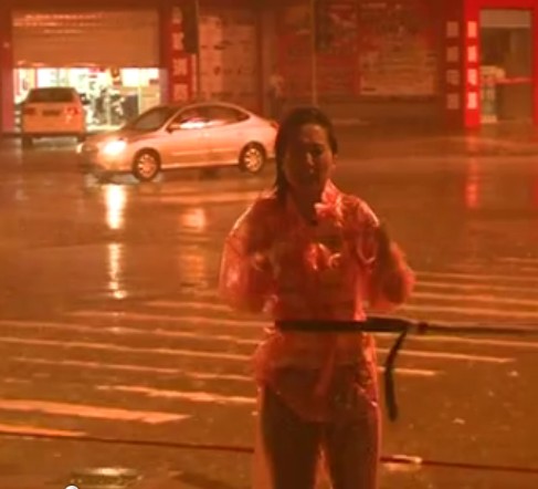 今年第11号强台风“海葵”的中心于8日3时20分前后在浙江省象山县鹤浦镇沿海登陆,登陆时中心附近最大风力14级。在“海葵”登陆前20分钟,宁波市气象服务中心北仑追风小组从北仑城区发回现场报道。为了防止被风吹跑,出镜女记者腰上栓绳进行报道。即便如此,女记者还是无法站稳,甚至一度不得不蹲下。