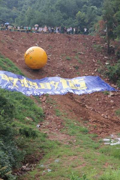 8月6日,义乌商人杨宗福“乘坐”自己发明的“诺亚方舟”从50米高的上坡上滚下来,向世人展示自己的发明。