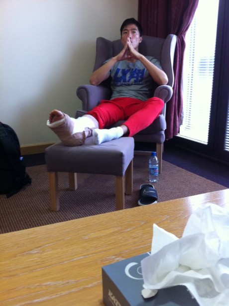 在抵达医院后,翔爸翔妈也终于见到了儿子,腾讯记者王正根也成为飞人在伤后首度与父母见面的见证人,王正根在微博中写道:来到医院,见到父母,翔眼眶也湿润了!同时他还配上了一张刘翔的图片,在图中可见刘翔双手并拢在脸前,而受伤的右脚跟腱则被厚厚的绷带所包裹。