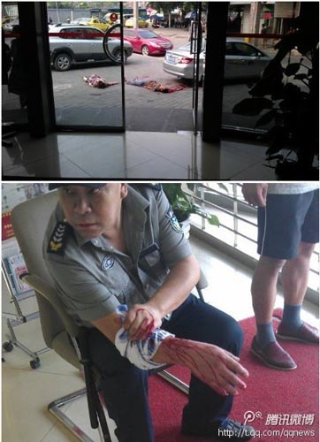 同时,记者获悉,一名男性伤者已被送到重庆市新桥医院进行救治。医院医务人员透露,该名伤者伤在颈动脉,伤势严重,目前仍在抢救当中。另一名伤者银行保安被送往重庆沙坪坝区门诊就医。