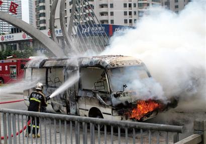 “在山东路与敦化路路口,有一辆中巴车自燃了,火势很大。”昨天上午,市民魏先生拨打早报热线82888000报料。记者