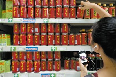 昨日,崇文门乐天玛特超市内,两种“红罐”在货架上并列。