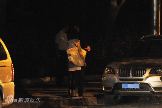 当晚,一身素雅白裙的袁泉开着开着突然停下车,站在另一辆车前,高举左手,与车里的人打起招呼。车里的“胡须文艺男”也颇为意外,立马下车,与袁泉站在路边开摆龙门阵。“文艺男”边聊边辅以手势,看上去是许久未见,忍不住谈论起某个艺术话题,袁泉则一脸认真地倾听,还下意识地用手轻抚脖子。兴致颇高的两人聊完后,袁泉步伐轻快地回到车上,驶回家中。