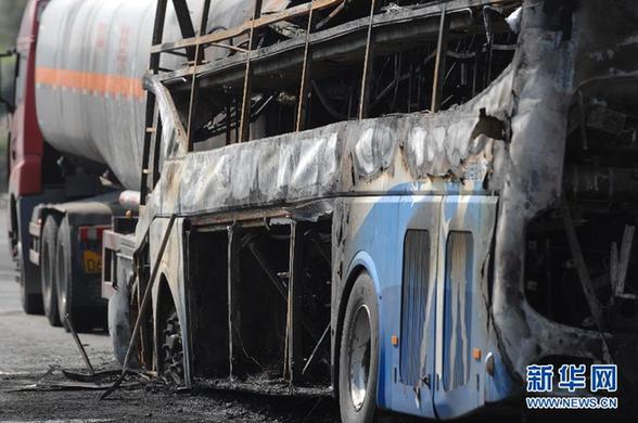 这是8月26日拍摄的事故现场。当日凌晨2时许,陕西省延安市境内的包茂高速公路安塞化子坪服务区南出口200米处,发生一起特大交通事故,一辆双层卧铺客车和一辆罐车(装有甲醇)追尾,并致两车起火,目前事故已造成36人死亡。据悉,发生事故的客车有39个座位,实坐旅客39人。事故发生后,有关部门领导迅速赶往现场,组织展开全力施救,目前事故现场的大火已扑灭,其中3人被送往医院。事故原因正在调查之中。新华社发