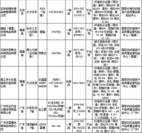 中国网8月28日讯据国家质检总局网站消息,质检总局近日公布了运动服装及针织泳装产品质量国家监督抽查结果。结果显示,PAYA(铂雅)、康踏、贺斯达、水鐺鐺 SWEET DANCER、金公爵、LEYIN雷鹰等6种产品不符合标准的规定,涉及到纤维成分含量、耐汗渍色牢度、pH值项目。