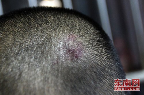 在福州华大派出值班室,记者见到了三位被打受伤的路人,被打部位都为头部和手臂,受伤处有很明显红肿。其中,受伤最重的一名未满12岁的张姓小学生便是之前保安所说的小孩子。其头部、背部、腰部及手臂均有多处红肿和淤青,尤其是手臂上的几处淤青甚至出现了破皮现象。等候做笔录的张同学仍惊魂未定,一旁的父母正怜惜地搂着孩子安慰情绪。
