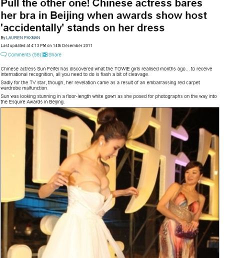 英国《每日邮报》报道称女星要想在红毯上获得国际关注,一种普遍的共识是撕开裙角,秀出乳沟,而孙菲菲遭遇的意外也充分证实了这一点。此次意外来源于一次尴尬的红毯走光事件。不过《每日邮报》提出质疑——为什么在出现状况的时候,孙菲菲还要双手伸展开,而不是试图用双手去遮住她走光的地方?英国媒体认为孙菲菲红毯上被踩之事实在是“小儿科”,欧美女星经常在红
