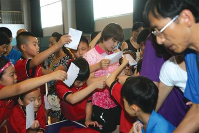 因为小队员实在太多,陈梦不可能和每一个人都过招,只能挑出几名代表,他们自然也成为其他孩子羡慕的对象。虽然打球不能人人有份,但另一项活动则是一个也不能少,那就是签名。小家伙们早就有所准备,有的举着球拍,有的拿着衣服,一下子全部冲上来,挤得陈梦一个劲地往后退,好几次都打了趔趄险些摔倒。教练们赶紧上来维持秩序,但孩子们的热情是谁也挡不住,陈梦只得一个一个全部签完才“脱身”。