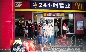 记者调查:4日中午1点,长沙火车站人流如潮。麦当劳餐厅里开着冷气,放着音乐,用餐的人不少,很多顾客都带着行李。微博中所述老人的“行李”就放在麦当劳门口的柱子那儿,好几个大包和好多个塑料袋,里面都装着空的矿泉水瓶和一些乱七八糟的东西,散发着一股异味。
