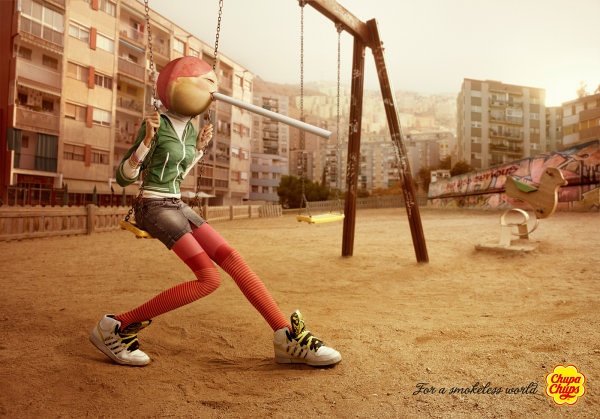 无烟世界,只有珍宝珠。——Chupa Chups珍宝珠棒棒糖。解读:背景是老旧的公园和阴暗的小巷,人物是身材消瘦的青少年,这是外国的吸烟者尤其人青少年吸烟者的一种普遍印象。而人物头像被处理成了棒棒糖,画面顿时多了些喜感,原来少年们更喜爱“珍宝”而非香烟。