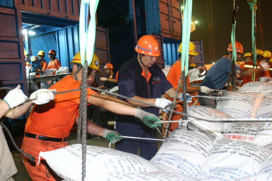 集团机关“夏练三伏”期间,青岛港集团主席、总裁常德传与装卸职工在一起大干