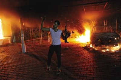 11日晚,数百名武装分子冲入班加西美国领事馆,抗议一部当天在此放映的美国电影诋毁伊斯兰教先知穆罕默德,并同领事馆安全人员发生交火。