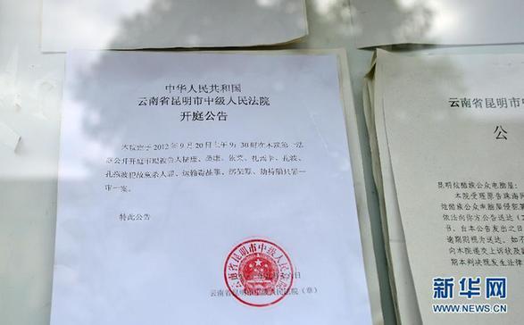昆明市中级人民法院公告栏中张贴的湄公河“10·5”惨案开庭公告(9月17日摄)。
