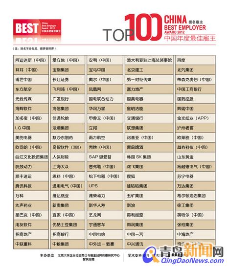 青岛新闻网讯 2012年9月25日,国内知名人力资源机构智联招聘联合北京大学企业社会责任与雇主品牌传播研究中心举办的“中国年度最佳雇主(2012)”(以下简称“最佳雇主”)活动在经过多重评选后,正式公布了“中国年度最佳雇主提名雇主100强”名单。据悉:此次“最佳雇主”报名成功的企业共有1554家,进入百强的比例为15:1。