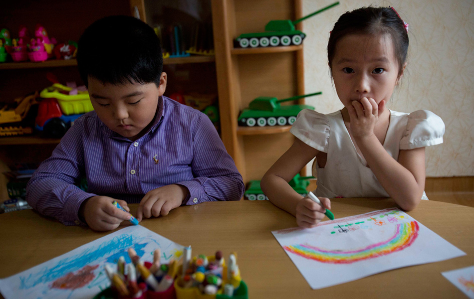 平壤一所学校内,孩子们为参观者表演画画。David Guttenfelder/摄