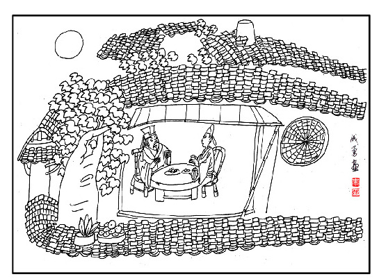 “各位看客这边瞧,云聚剧团新排的诸宫调《吴天塔孟良盗骨》。为博诸君笑,只有诸宫调。”一名辽人装束的艺人,一上台便博了个满堂彩,陆游定睛一瞧,原来观众在笑这“辽人”梳着的“髡发”。旁边一位看客朗声道:“你看这厮装扮成了丑角,把头顶心的头发都剃光了,周围留一圈,活像垫锅底的稻草圈。天底下还有人作这般打扮吗?”