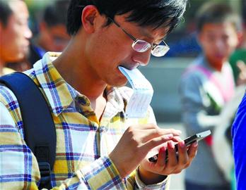 给家人发个短信:回去要晚一些。赵健鹏 摄