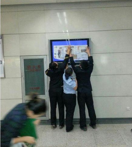 另有网友拍到,地铁工作人员正忙着往屏幕上糊报纸。17时16分左右,北京地铁官方微博对此做出回应,表示具体原因正在进一步核实,并向乘客致歉。图片来源于网络