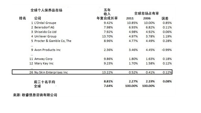 全球少数几位掌控个人保养品产业的龙头老大最多拥有百分之十的市场占有率。虽然NU SKIN呈现较少的市场占有率,但可以保持较高的销售增长率。事实上,NUS是过去五年以来市场上拥有最高年增长率的前三十名之一。由于整个行业的高增长率及曾为行业领导者的雅芳(Avon)停滞不前,使NU SKIN 的销售扩展拥有很大的空间。
