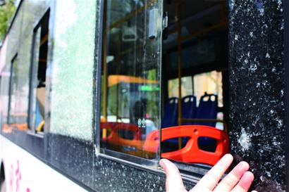 昨天一早,驾驶员汇报了意外情况后,安全员梁师傅开始查看车体,结果发现与破碎玻璃相连的玻璃上有一个蚕豆大小的凹痕,他判断这是圆形弹珠击中固定玻璃的同时,巨大的惯性震碎了相邻的车窗玻璃。